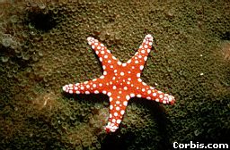 This star-shaped carnivorous animal is usually a dull yellow or orange, but can also be brightly colored. As a natural defense mechanism, the starfish is able to change its body color to hide or escape from predators. Starfish vary greatly in size from under 1/2 inch to over 3 feet. The arms of the starfish are used for movement, catching prey and digestion. Unlike other animals, the starfish is able to grow a new arm if one is lost. Many starfish have five arms, but there are some deep-water species that carry more than fifty. The starfish's arms surround a small disc-like body, which houses a mouth in the center of the underside of the body.