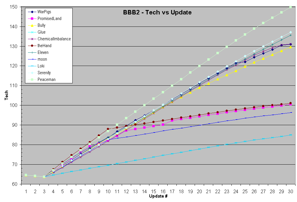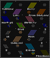 in this order: The "Golden Star Ribbon" goes to ChemicalImbalance for finishing on the top of the power chart. The "Silver Medal of Honor" goes to Bully for the runner up position and having the most sectors. Serenity is awarded the "Bronze Badge" for 3rd place. Eleven receives the "4th Place Pin". Also the only country to take one of those nasty single sector mountain islands. Peaceman is awarded a fifth place "Commemerative Bottle Cap". Also was the tech leader. WarPigs took a strong Sixth Place, and shall receive a pocket lint collectors guide. Glue is awarded a "Seventh Place Staple". Loki walks away with the "Magic 8-Ball Origami CyberClub Trial Membership." theHand finished off of the official end game power chart. PromisedLand finished off of the official end game power chart. moon finished off of the official end game power chart. BBB2 Deities were Bungholio and Ski. |