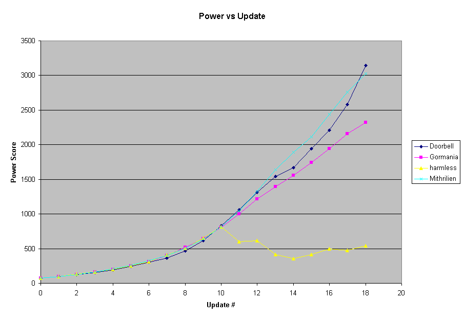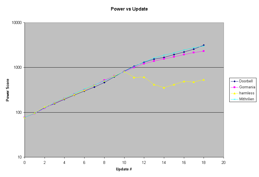 The following 2 graphs show each country's Power vs Update # for the game, the first