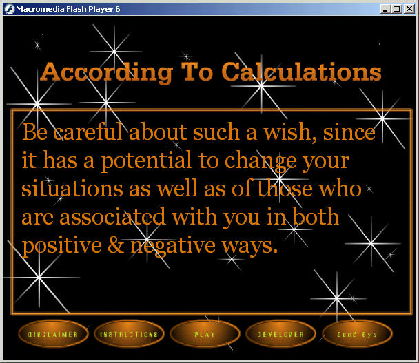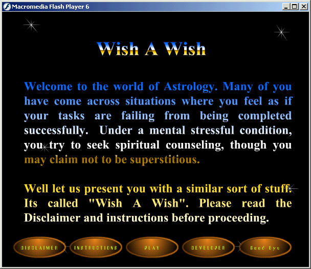 Most of you may have arrived at a situation where you find that your wish or the tasks undertaken by you are either being blocked from their fulfillment by environmental or other factors. Depressed by situations you seek Spiritual Guidance like Astrology and any such stuff which may relieve you from such stress. Well let me present you with something that may refresh you from your situations. I have developed a tool called as Wish A Wish based on Macromedia Flash. Its like you have to close your eyes, select a wish and click on the set of numbers, to get the resultant report. Refer to the screenshots below.