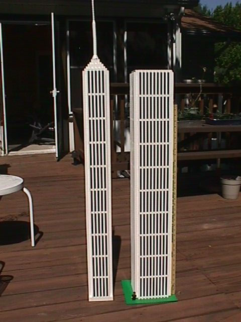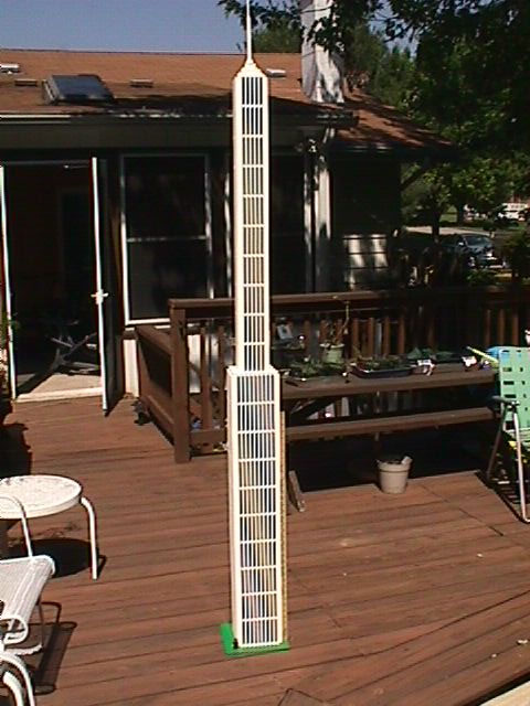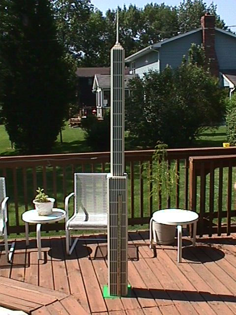 The Imperial Skyneedle contains approximately 12,500 pieces. It stands over 6 1/2 feet tall. It is made of 100% Lego parts. A yard stick is on the right side of the building for scale. Also, a lego mini-figure is on the bottom left of the tower. The Imperial Skyneedle is over 250 blocks tall. The base is 19 bricks by 19 bricks. Each of the black sections if 10 bricks tall. The upper section is 11 bricks by 11 brciks with the black sections also 10 blocks tall. Only 2 Skyneedles will be built. If you would like to own this building, make an offer. See purchase information on the home page. In addition, if you have any questions please e-mail me at LegoSkyscraper03@hotmail.com