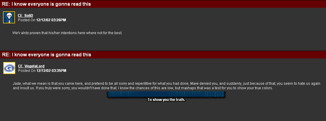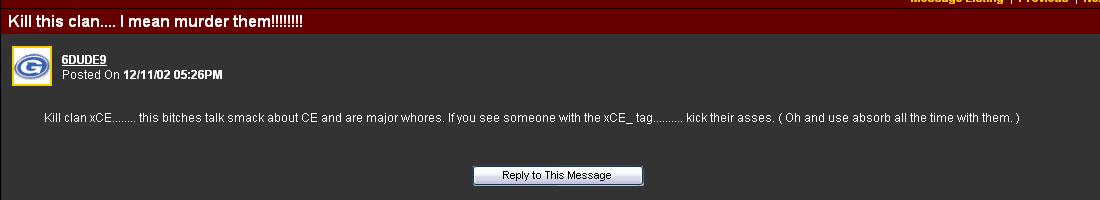 "It's a trick." -SoliD "Denied.... CE has had many a clan that have declared war on us or challenged us or threatened to kill us off. This is impossible. This clan was founded under brotherhood, friendship, and loyalty. You can't kill something off that you can't battle, that is spirit.... I must say again that you are denied." -Maverick "No friends, no enemies, only allies and adversaries (JFC), you just might want to keep that in mind Jade, it's very valuable advice." -Kalit I'm not sure who this Jade person is, but it sounds like s/he doesn't deserve to be a member. Maverick proved that point. It's obvious from her turnaround (after she was denied) that there was no real intent or commitment to her CE membership in the first place." -IKoRn HoRn "LmAo - I told you Jade......." -Arven As you can see, I was never given a chance. It's too bad but I find it amusing that Kalit said that there are no friends, enemies but only allies and adversaries. Either he is majoring in college in political correctness or he's struggling through his synonyms in high school English. Also funny that Maverick seems to think that it's impossible to kill them off, because he's right. Do you know why? IT'S A VIDEO GAME DUMBASS! |