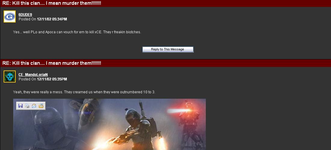 Perhaps they didn't read my last post, which was "Alright no problem. I hope you don't believe now that every new applicant is me in disguise though. We will continue to work against Plo Koon and the rest whom follow his example of game play and talking smack because I wasn't aware that the CE fellowship meant being complete asses to everyone else". So how does this constitute as an insult to the entire clan. It was directed at Plo Koon and his ilk. Too bad, I've been banned now, but all is fair in love and war I suppose. |