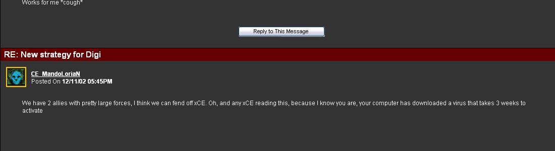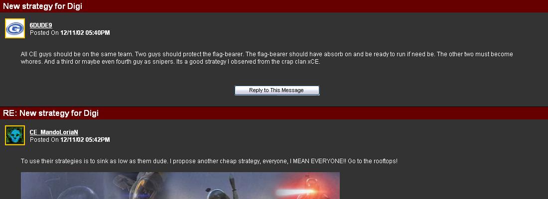 I mean, wow. Crimson Empire is now coming up with strategies to beat us. I should feel honored to be posted about. I'd hate to see the high and mighty CE clan sink as low as us and use out tactics. Heaven forbid that you use every weapon available. I mean, you people are probably the same ones who would rather have invaded Japan in WWII rather than use the atomic bomb. |