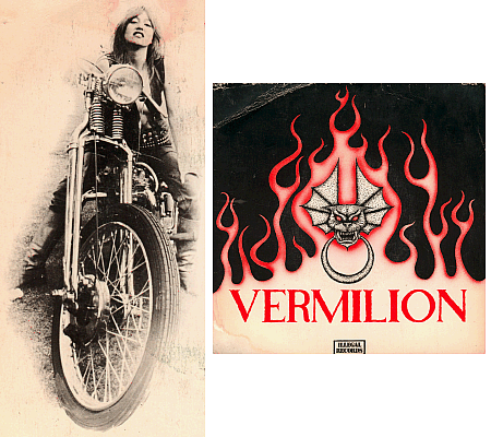 VERMILION was a UK 70s biker rock punk gal,....The EP was released in 1978 on Illegal Records (ILM 0010), original UK pressing. A side: "Angry Young Woman" and "Nymphomania" are both fast punk tracks.........especially 'Nymphomania' is the standout......... real biker rock, and raunchy! the b side is 'Wild Boys' ( ride their bikes ) it's said to be really cool; raw heavy sound similiar to the STOOGES....