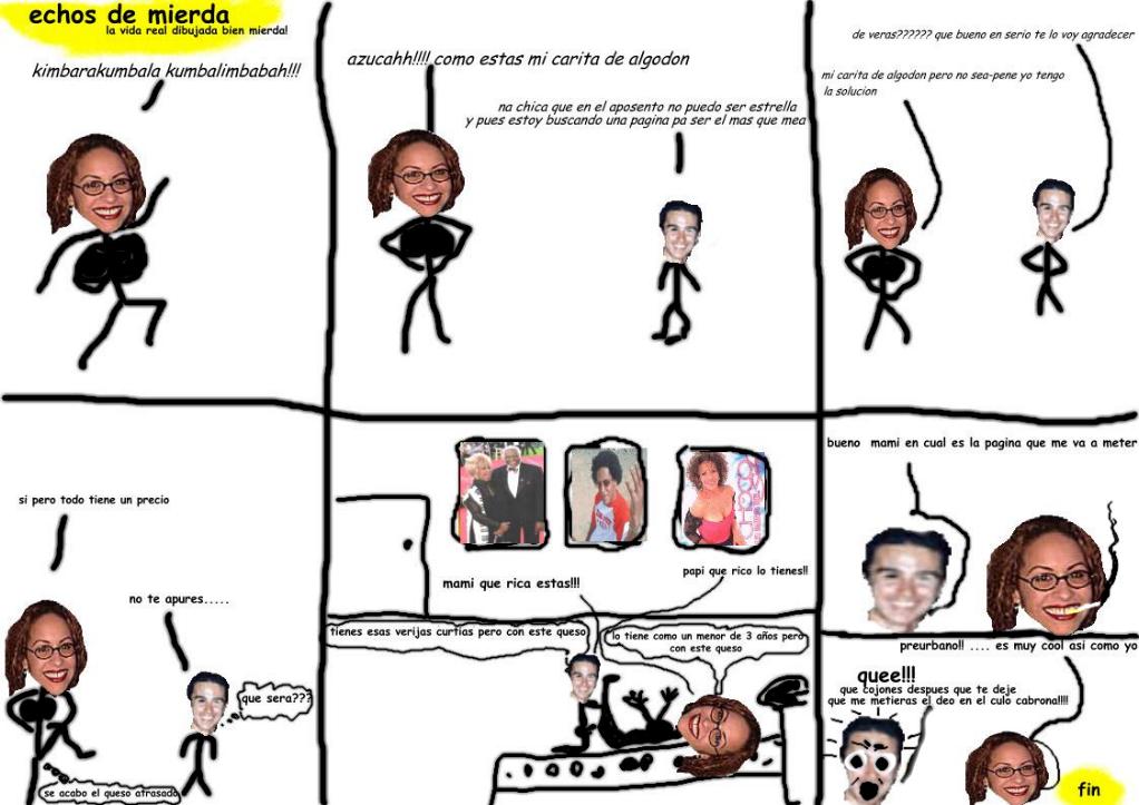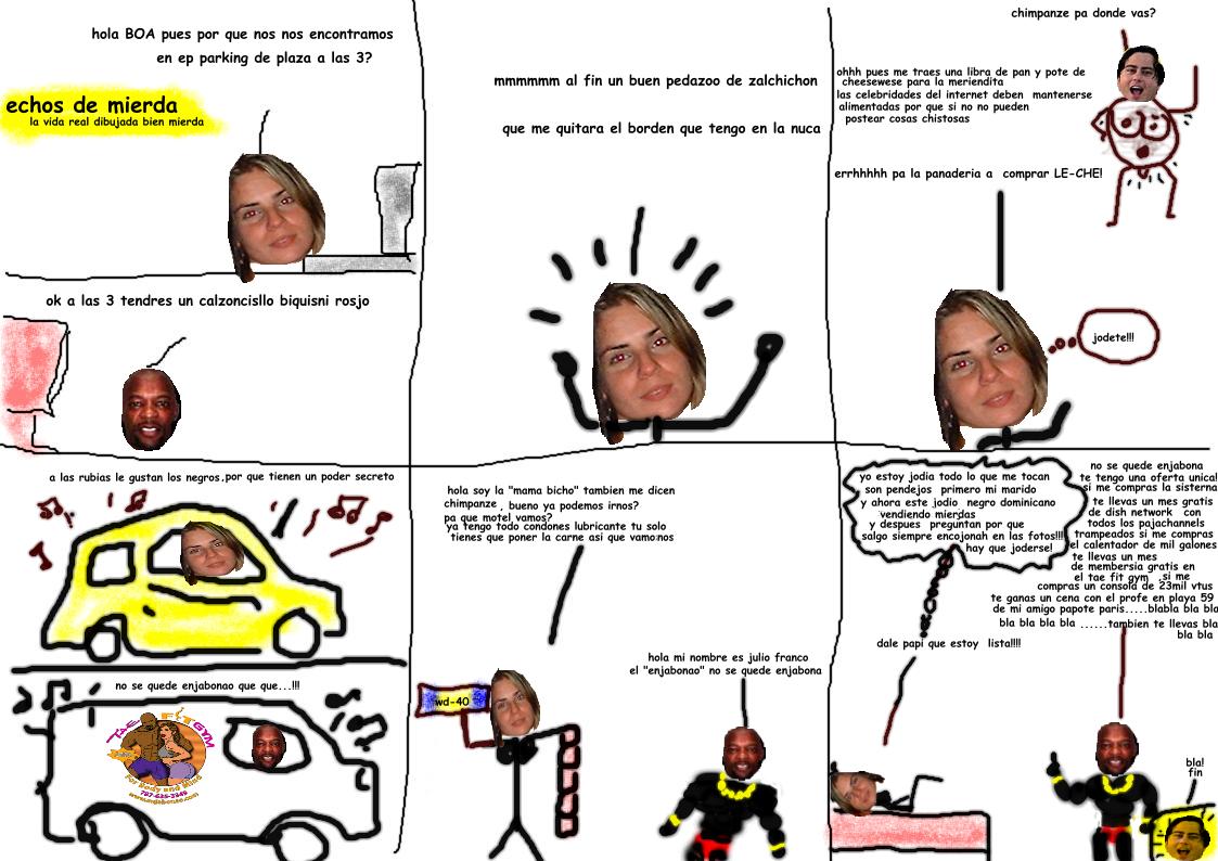 azucaa!!!!!!!!!!!!!!!.....vayah caballoh hoy nos vamos con una hostoria cubano-boricua pues le presentamos una nueva seccion dentro de muñeco chismes y es la tirilla comica que revolucionara el mercado de las tirillas comicas,ju-JU!...se llama ECHOS DE MIERDA...hoy en ECHOS DE MIERDA le presentamos una historia de amor sobre una ex aposentoholica y un ex aportero.....en que mundo estamos viviendo...acontinucacion con todos ustedes el estreno mundial simultaneo con Tegucigalpa Honduras