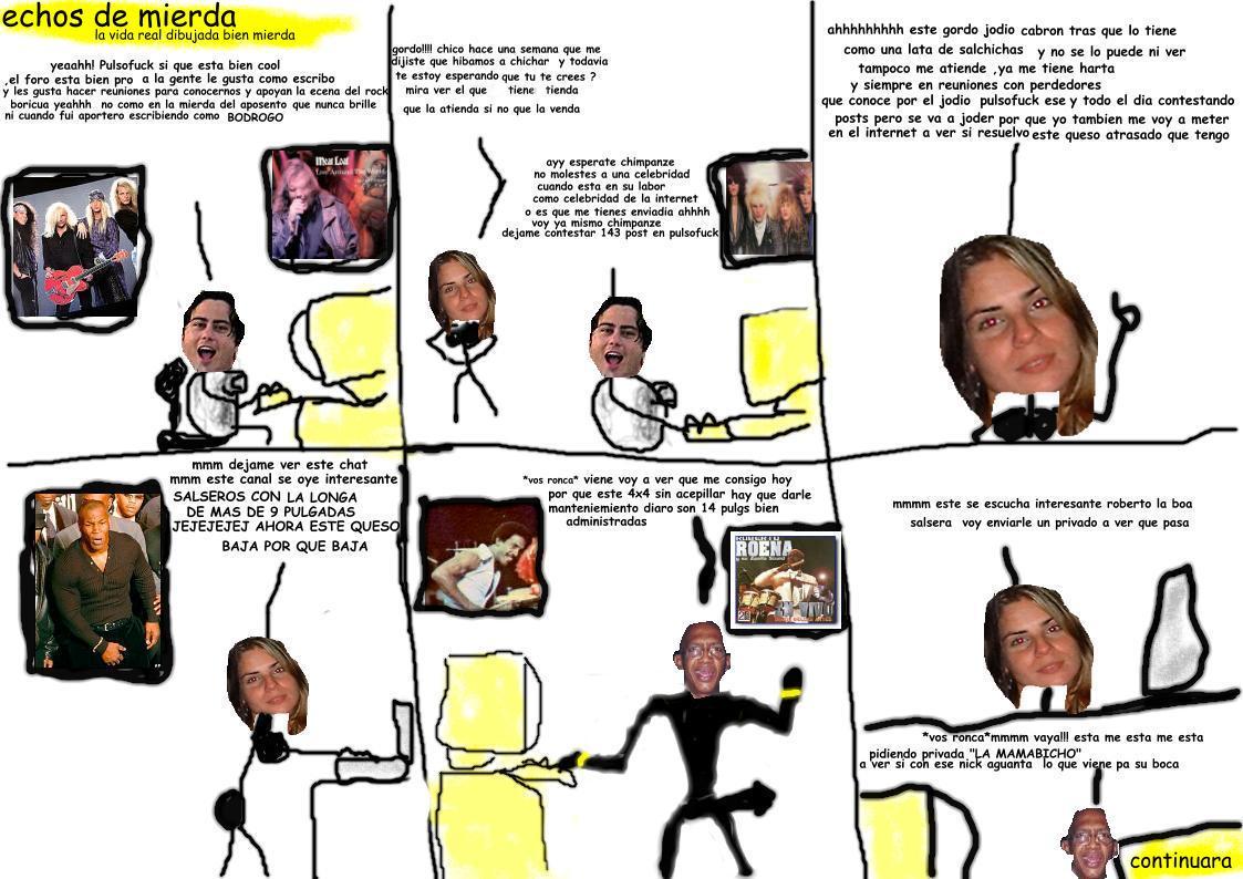 *a son de merengue*"comooooo dueeeleeeeeeeeeee ,saber que no te quiereennn...............que que que que queeeEEeeeEE.....llego aqui el mas pegao! el maldito me gustaria informarles para que su envidia hacia mi siga y siga y sigaaa.. pues aparente y alegadamente conocido imperio de internet quiere solicitar mis servicios pero como a ustedes eso no le importa por que su trabajo es solo entrar aqui y ver lo cabron que estoy,sigamos... la nueva tirilla comica ECHOS DE MIERDA esta pega.. que carajo si es mia... bueno hoy le tenemos una historia muy punzante controvercial y espeluznante(embuste en realidad es la historia de como nacio pulsofuck)