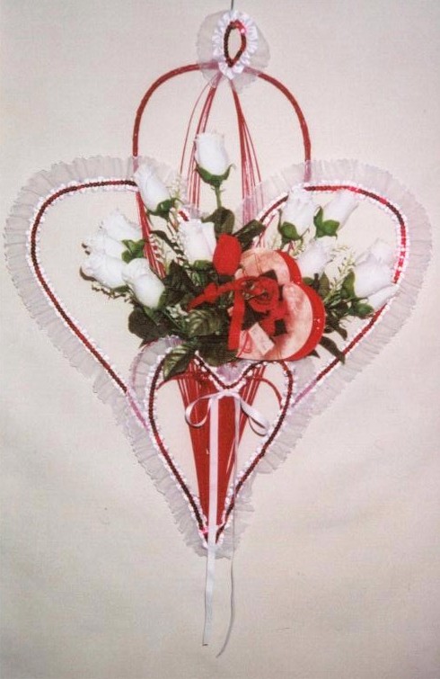 Another Wall Hanging #603b Fancy wall hanging complete with flowers! Your choice between white, pink or red roses. Adorned with bows and a box of chocolate is included. Height is 25".