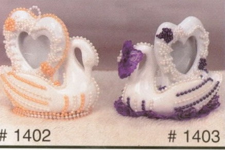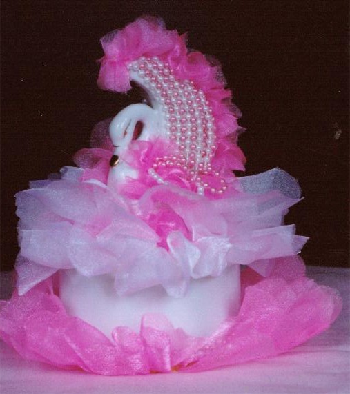 Pink & White Swan Powder Compact! Gorgeous old fashioned powder compact. Porcelain swan with pink and white pearls adorning the gift. Also decorated with white and pink sheer mesh and pink feathers. Truly adorable! *Call For Pricing