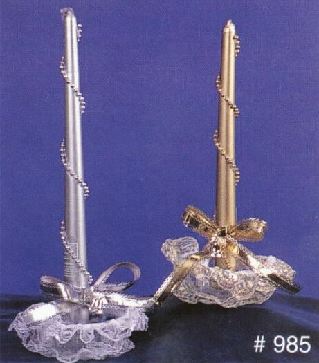 Spiral Beaded Candle w/ Holder #985 Charmed with a bow and bell, this candle with holder is a real beholder of beauty and will dress up any table. Select any set of two 10" or 12" candles. Choose from gold or silver.