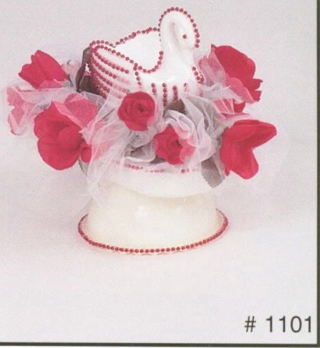 Swan nestled in a bed of roses and white tulle! #1101 A precious centerpiece for any occasion. All of the arrangements have white mesh as a primary w/ one color choice for roses! Lavender & Green also available.