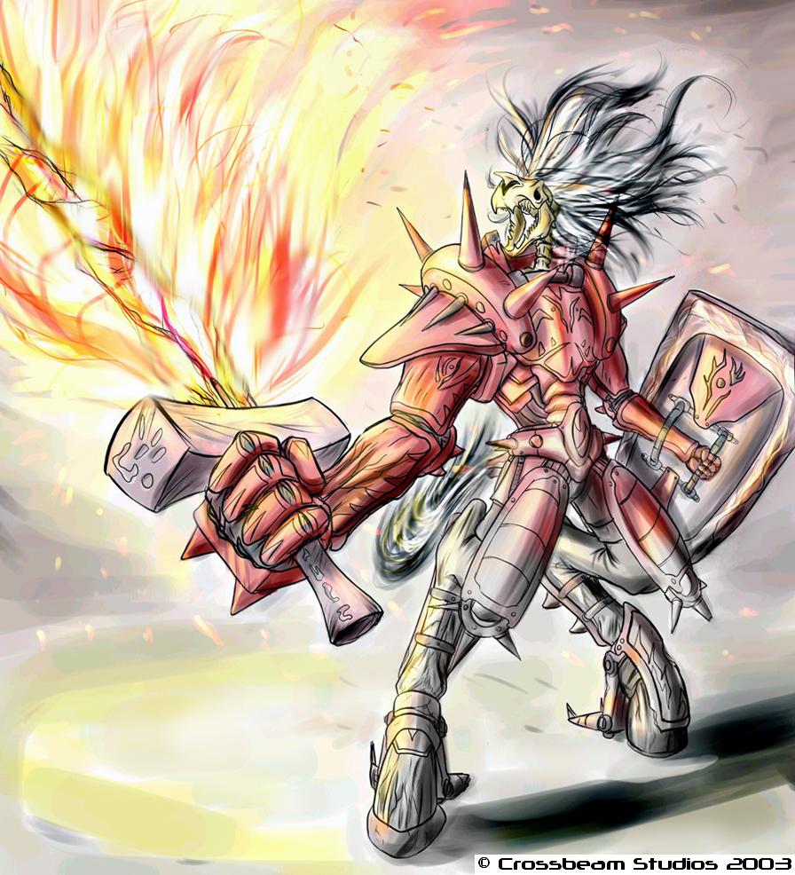Motar has a skeletal horse's head with a mane of black fire, huge red steel suit of spiked armor, one huge right arm carrying the sword of flame, one withered left arm carrying an onyx stone tablet, and his lower body slowly petrifies into the earth below him.