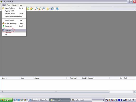 3) A read me on DC++ will be launched, read it if you want, then just close it. In DC++ Click File à Settings.