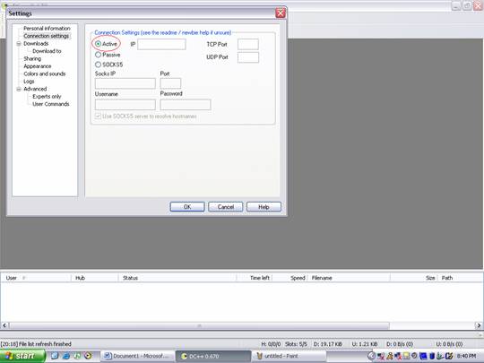 5) In settings, click on Connection Settings on the left. Make sure Active mode is selected. (Advanced Note: If you use your own hardware firewall\router, you MUST type in your IP {get it at http://www.whatismyip.com) and you need to forward a port to your computer