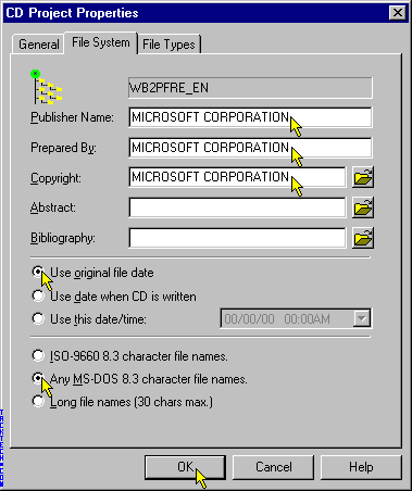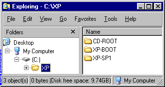 | You will need the following items: 1.) A copy of the original Windows XP CD or ISO 2.) The latest version SP1 (currently in Beta, only) ~132MB 3.) The boot file which you can download here (bootfiles.zip / 1.07KB) 4.) CD Recording Software (Roxio Easy CD Creator Platinum v5.32 was used in this example) Created a folder called XP on your hard drive (C: is used in this example). A minimum of 800MB is required. In this folder create three sub-folder called CD-ROOT, XP-BOOT, and XP-SP1. The end result will look something like the following image. Copy the entire Windows XP CD (or extract the ISO) into folder CD-ROOT. Copy your Service Pack 1 file into C:\XP Rename the Service Pack file to XP-SP1.EXE Extract the Service Pack from the Run Dialog using the command: C:\XP\XP-SP1.EXE -U -X:C:\XP\XP-SP1 Apply the Service Pack 1 to the Windows XP in CD-ROOT using the following command from the Run Dialog: C:\XP\XP-SP1\UPDATE\UPDATE.EXE -S:C:\XP\CD-ROOT ![]() ![]() Extract the BootSector file (boot.bin) from bootfiles.zip in to the folder C:\XP\XP-BOOT Start Easy CD Creator. Select File > New CD Project > Bootable CD from the menu. 1.) Set Bootable CD Type: to No Emulation 2.) Set Load Segment: to 0x7c0 3.) Set Sector Count: to 4 4.) Press the Browse ... button Locate the BootSector file (boot.bin) in the folder C:\XP\XP-BOOT Press the OK button Select File > CD Project Properties Enter the Volume Label as WB2PFRE_EN Set the File System to ISO9660 Set the Physical format of CD to Mode 1: CDROM Enter MICROSOFT CORPORATION in the Publisher Name:, Prepared By:, and Copyright: Select Use original file date Select Any MS-DOS 8.3 character file names. Click OK Select Add all Files Make sure that the Do not add Hidden files and Do not add System files are both unchecked Click OK Select all files and folders in the C:\XP\CD-ROOT folder Click the Add Button Click the Record Button Select Record CD under Recording Options Select Disc-At-Once under Recording Method Click Start Recording Button Wait for CD creation to finish. Click OK Process complete. You're done. Source: https://www.angelfire.com/extreme/Daytony/Creating_a_bootable_Windows_XP_SP1_CD__Easy_CD_Creator_.htm |