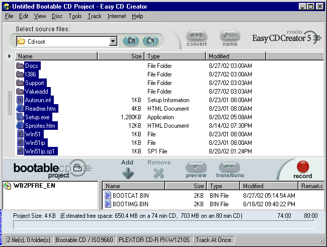 | Creating a bootable Windows XP SP1 CD (Easy CD Creator) |