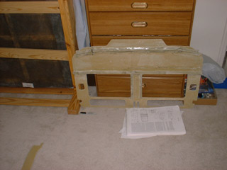 This chapter is fairly easy, mostly you do flat layups with different materials. An excellent place to start for first time homebuilders. First thing you will notice is that these pieces are much larger than the practice layups...Much larger! But they still are easy to knock out! There are really only two points that were the least bit difficult for me. First was the harpoint for the landing gear attach. It is made from 22 plys of BID. Two hardpoints made from one piece. But I had a lot of scraps left over (some from an early miscut) so I made two small pieces and cut one hardpoint from each piece. That was easy, but difficult was getting 22 plys of BID to line up on an edge. I just couldn't get the knack for doing it without stretching the cloth to some distorted form of what it use to be. This made it hard (more like impossible) to measure it's thickness. Finally I gave up and decided to just go with the 22 plys and hoped they would be 1/4" thick for fitting in the foam. Well I got lucky, they fit beautifully! The other stickler were the stiffners on the instrument panel. Here you need to make a few funny angles, and get the cloth to form a channel. Nat fails to mention the best method for this. Most people (including me) cut wood the same length and height of each stiffner, wrap in duct tape (or clear packing tape) and use these as a guide. This method works out great! If I did this again I would use BID tape to create the channels as it doesn't have the tendency to unravel like cut bid strips. But since I used cut bid, I made the channels a bit larger than they needed to be and then cut them to size with my dremel and a cut off wheel. Sorry for the lack of construction photos, but these were lost in my hard drive failure. One chapter done....twenty-two to go!