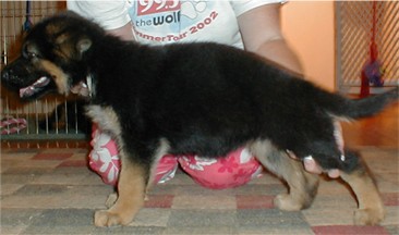 This pup is dominant and self-assured, also high in Fight Drive. He can be provoked to bite; however he readily accepts human leadership that is firm, consistent and knowledgeable. This is not a dog for a tentative, indecisive individual. In the right hands, he has the potential to become a fine working or show dog and could fit into an adult household, provided the owners know what they are doing.