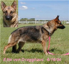 Ellie von DraggahausEllie's page Ellie is out of our Kender and Della. She has just resently produces a great litter for us here. Her puppies have gone from CA to Alaska. She is a very affectionate girl, and loves to be with you. She is a prey driven dog, and could be a very sucessfull herding dog, but her calling is assistance work. She lives a very good friend of myne that needs her help on the farm. She produces very nice puppies that are easy to control. They have large bone and very nice conformation. She is red sable, with nice coat. Click here to see pictues of her and her puppies.