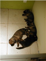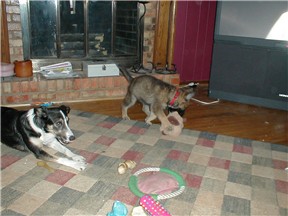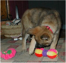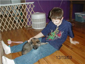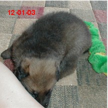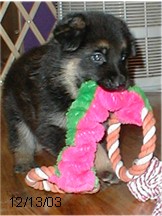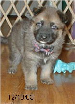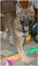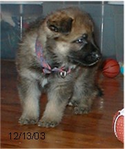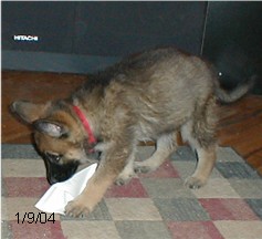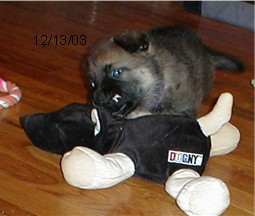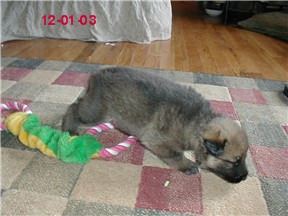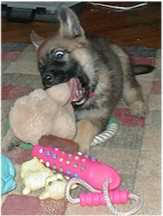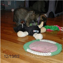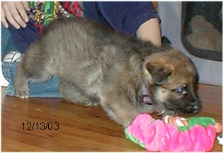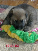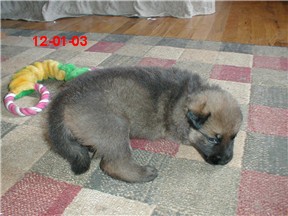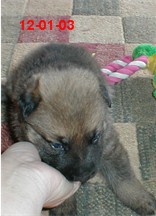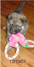 We have named this pup Sicci. She is a very sweet girl. All these pups love to play with thier toys, and she is no exception. She is the most calm out of the group and loves to cuttle. Sicci has been doing great with her house breaking. She will go to the door and wine that she wants out. She is very quick to do her "business" and then come back in the house. She will play nicely with her toys and so far has not distroyed anything that wasn't hers to play with. She will make a great house companion for someone. She is good with kids and other dogs, and cats.