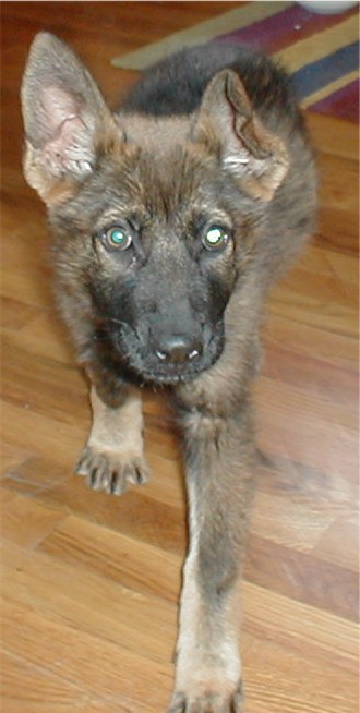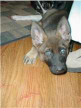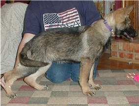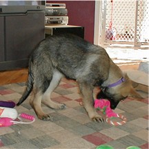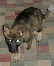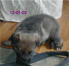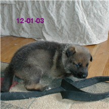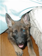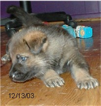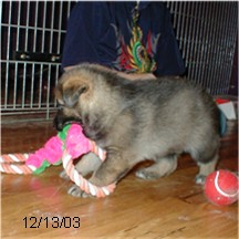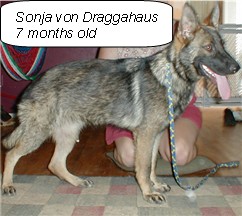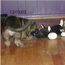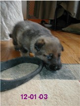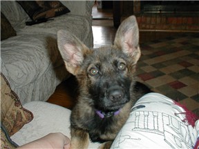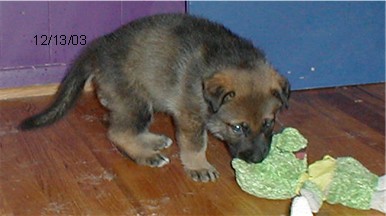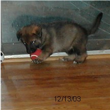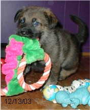 This is Sonja. She is a bueatiful dark sable female pup. She is housebroken and crate trained. She has some "puppy" obediance and will sit, down, and come. She loves her toys and plays very well with other dogs, big or small. She is very good with children and not mouthy or jumpy. She is not distructive and very easy to train. She is very willing to learn and loves to train. Sonja is $1800.