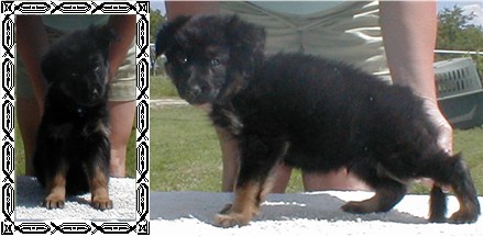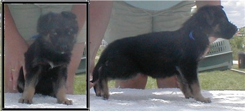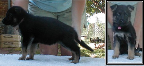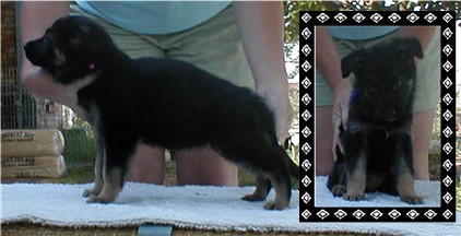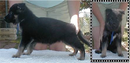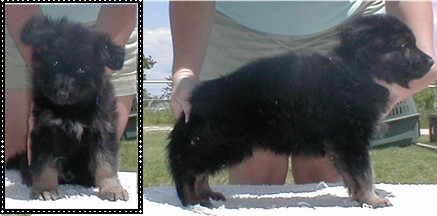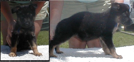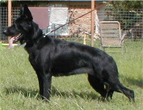 Zena is our newest solid black female. We have had her for about a year now, and she has produced some very nice puppies for us. She is 1/4 German and 3/4 American. She really takes after her German lines though. Her puppies can do AKC confermation and will do well in the ring. She produces large healthy litters, we have had very nice hips and elbows out of her.
