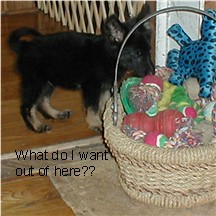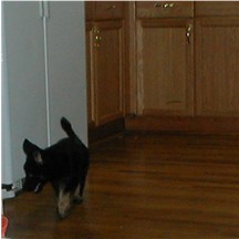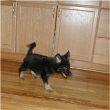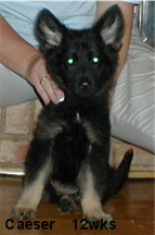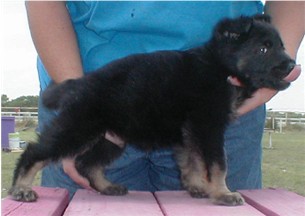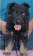 We have named this boy Ceaser, and he fits this discription. He is independant and very aware of what is going on around him. He would make a very good home security dog. He is very dark, looking alot like a bi-color dog. He has nice size bone and will be a good size boy when he is grown. He has a very large male head and outgoing personality. He really has no fear about anything. He has learned house manners, to sit,down,here, and is being crate trained. He will beging leash training this week. He has a longer plush coat.