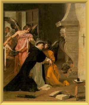 ![]() De acuerdo a la mitologia cristiana en esta pintura los ángeles reconfortan a Santo Tomás y le conceden la estola de la pureza perpetua |