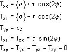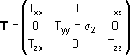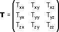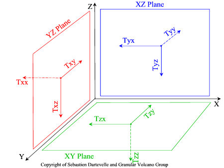 where Txx, Tyy, Tzz represents the normal stress acting on the YZ, XZ and XY planes respectively, Txy, Txz are the shear stresses acting in the Y-direction and Z-direction respectively on the plane YZ (whose normal is X), Tyx, Tyz are the shear stress in the X- and Z-directions respectively acting on the plane XZ (whose normal is Y), and Tzx, Tzy are the shear stress in the X- and Y-direction acting on the plane XY (whose normal is Z). Since a stress tensor must be symmetric, we have Txy = Tyx, and Txz = Tzx and Tyz = Tzy (see Fig. 1).