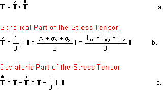 where I is the unit tensor and IT is the first invariant or the "trace" of the stress tensor (i.e., the sum of the diagonal element). IT is said to be invariant because it is independent of the chosen coordinate system (e.g., the sum of the diagonal element in the Cartesian or Principal direction coordinate system is the same) as indicated by Eq.2b. Obviously, the sum of the diagonal elements of the deviatoric stress tensor (Eq. 2c) is equal to zero, hence the deviatoric is said to be "traceless".