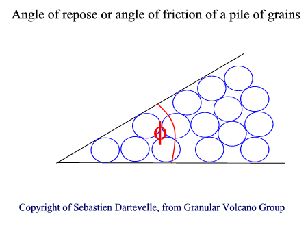This angle of repose is low when grains are smooth, coarse or rounded, and, it is high for sticky, sharp, or very fine particles. Typically, it is between 15° and 45°. Experiments suggest that this coefficient of friction drops when motions begins, i.e., the kinetic friction coefficient is less than the static coefficient. However, no data exist for granular material, and the universal assumption is that the kinetic and static coefficient of friction are more and less equal.