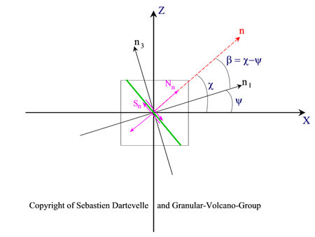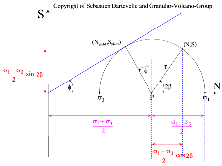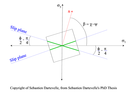 ![]() [Figure 7: Orientation of the Slip-planes relative to the major and minor principal stresses. Phi is the angle of internal friction of the granular material. Those geometrical relations are given by Eq. 11] |