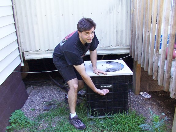 This is a picture of me inspection and maintaining our air condition unit to keep it in excellent working order.