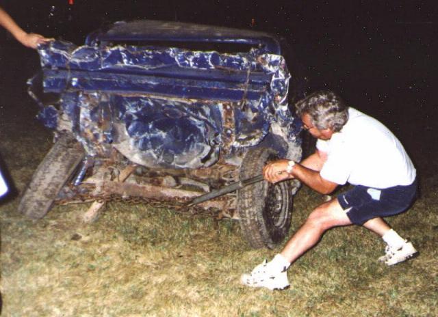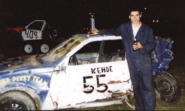 I got this car from Deline Auto in Tweed. Once again it was a free car. Excellent condition. Took it to the Belleville free for all. placed 5th. Electrical problem. Fusable link. Took it to Mowhawk. Blew all spare fuses I took into my heat. Hardwired it and went for a WILD RIDE. 1st place in the hard luck heat. 2nd place in the feature making HUGE HITS one after another. Put a major beat down on the competition. The last hit I made the trunk hit my seat, broke it and knocked me out cold. There was nothing left of the back of the car to hit with. Once again the Chevy 2.0L was amazing!