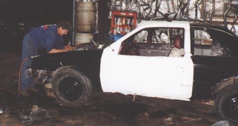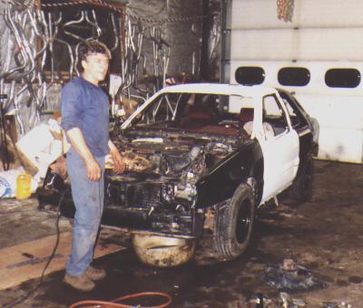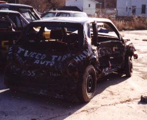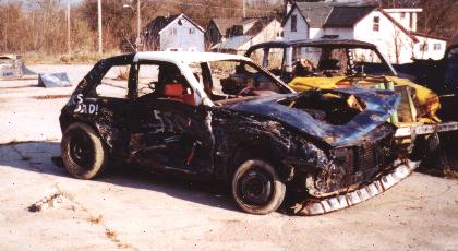 1990 Dodge ShadowI built this car for the 2001 Madoc Fair derby. Put hours and hours into this car and was confedent that it was going to be really tough. The morning of the derby I had a problem with the fuel pump. With not much trouble I got it fixed. 4 hours before the derby I went to start the car but it wouldnt fire up. It drove fine the night before. We spent 4 frantic hours trying to figure out why there was no spark. Finally found out it was the computor. I was so agry I put a beak hammer through the roof of the car. Its parked for now and I will get it running for Tweed fair 2002. Finally found the 1/9000 wire that was broken and got the car running. Once again I drove the car too hard. Got clipped in the front wheel and took 3rd in my heat. Lasted most of the feature but as you see the ass end went down slowing the car and I got longtracked to the passenger side, rad hose blew, soaked the computor/wiring, car stalled.