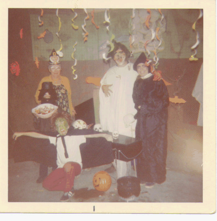 Below are a few pics from the past years. (1972) This was back in 1972 at my parents house. My mom and dad set up the garage as a walk in haunt with black lights, dry ice and things hooked up to the garage door opener to move. More than just your "go up to the front door get your candy" type of deal back then. My grandmother top left with my dad and then mom. My younger brother Dan in front of my grandma and me in the green mask kneeled down with my cape open (figures, I really got into it, even at age 8).