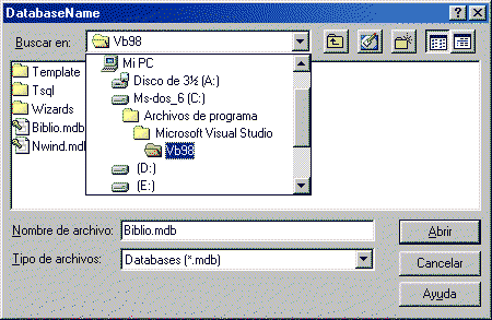 En la propiedad DataBaseName indicaremos la base de datos Biblio.mdb que en la versión 6 de Visual Basic lo podemos encontrar en la carpeta c:\Archivos de Programa\Visual Studio\VB98 tal y como aparece en la imagen: