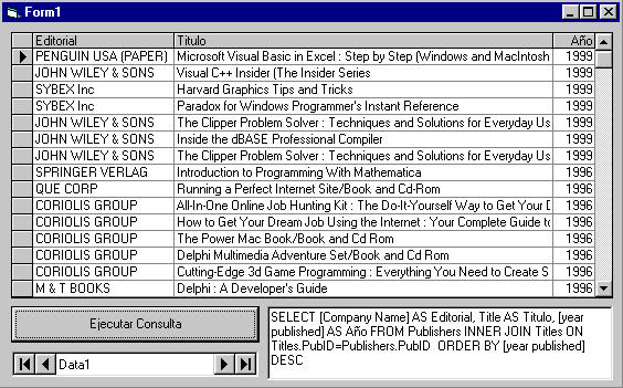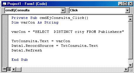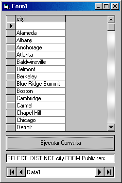 Ahora sí vamos a ver unos ejemplos del uso de SELECT desde Visual Basic. A partir del fichero de base de datos Biblio.mdb, usaremos la tabla Publishers para obtener las distintas ciudades de las editoriales sin repetirlas usando DISTINCT.