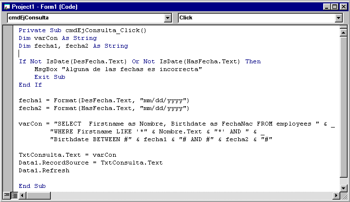 Hemos utilizado la función IsDate para comprobar si las fechas son válidas antes de hacer la conversión a formato americano y pasarselas a la sentencia SELECT.