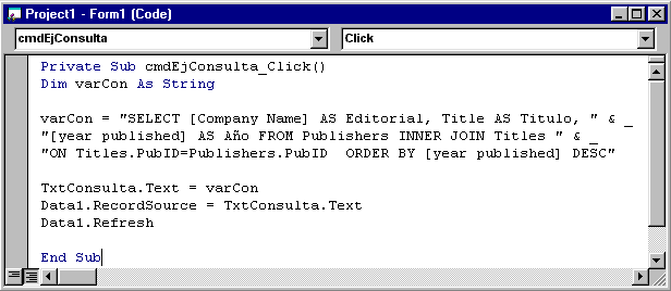 En el botón introduciremos el siguiente código, el cual asignará la sentencia SELECT al control Data y lo refrescará para que aparezca el resultado en el DBgrid: