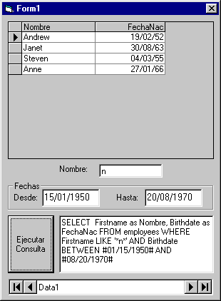A partir de la tabla Empleados de la base de datos Biblio haremos un formulario que nos permita saber que cuales son los que han nacido entre las dos fechas que le digamos y que tengan en su nombre la cadena de caracteres que introduzcamos.