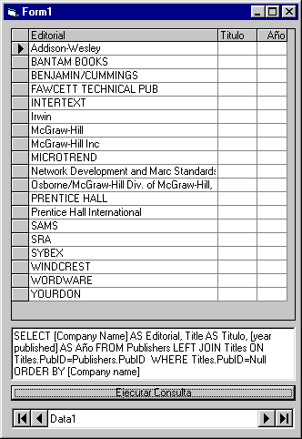Mediante un ejemplo vamos a ver como obtener, a partir de la base de datos Biblio.mdb, una consulta con las editoriales, los titulos publicados por cada una y ordenados por el año de publicación de forma descendente.