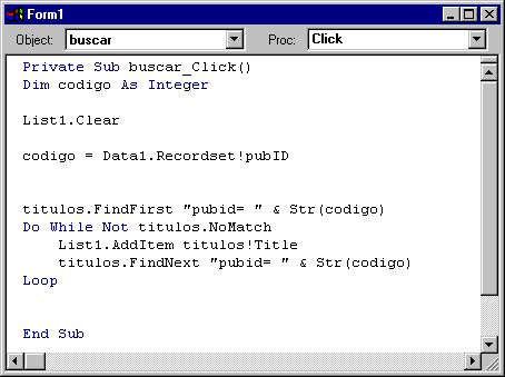 El código del botón Buscar toma el codigo de la editorial que hayamos apuntado en el control DBgrid y realiza búsquedas en el recordset títulos, añadiendo al control ListBox los campos que cumplan con la condición de búsqueda.