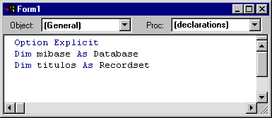 A continuación le daremos valores iniciales a estas variables(objetos) que son las que contendrán los títulos en los que se realizará la búsqueda. Se ha asignado el recordset títulos con el modo dbOpenDynaset para que pueda utilizarse el método de búsqueda FindFirst. También podría haberse tomado el modo dbOpenSnapShot si no se necesitan realizar modificaciones sobre esta tabla.