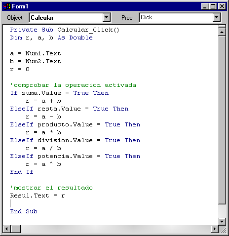Para el botón Calcular que es el que nos mostrará el resultado según la operación seleccionada, he utilizado la instrucción If Then Else que vimos en el capítulo anterior: