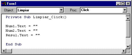 Los controles TextBox tienen los nombres: Num1, Num2 y Resul.