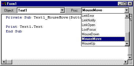 Lo que tendremos que hacer es seleccionar el evento que necesitemos de la sección Proc, en nuestro caso mousemove y a continuación teclear el codigo correspondiente: La instrucción print visualiza un texto en el formulario y si le ponemos text1.text le decimos que nos muestre la propiedad Text del control Text1 que ese será el nombre que tendrá el control por defecto si no lo hemos cambiado en la propiedad name.