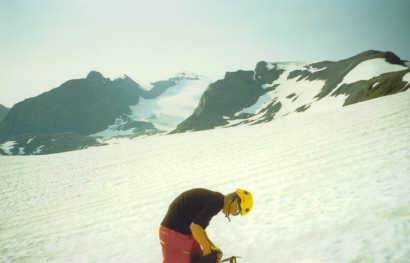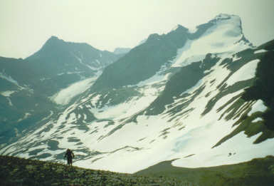 July 17, 02- In order to gain the connecting ridge between Warrior and Cordonnier you have to cross this small snowfield. Mt. Joffre is in the background.