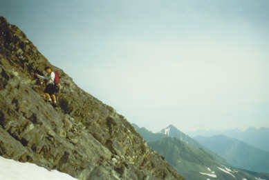 July 17, 02- Here is Colin climbing to the ridge on solid slabs.