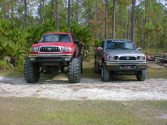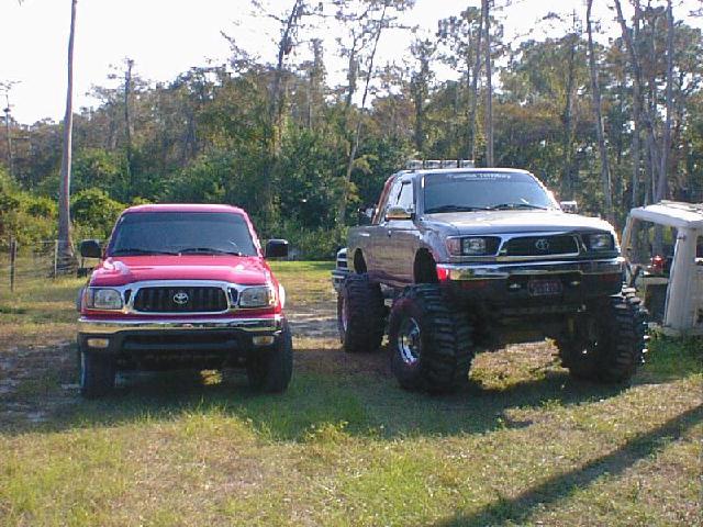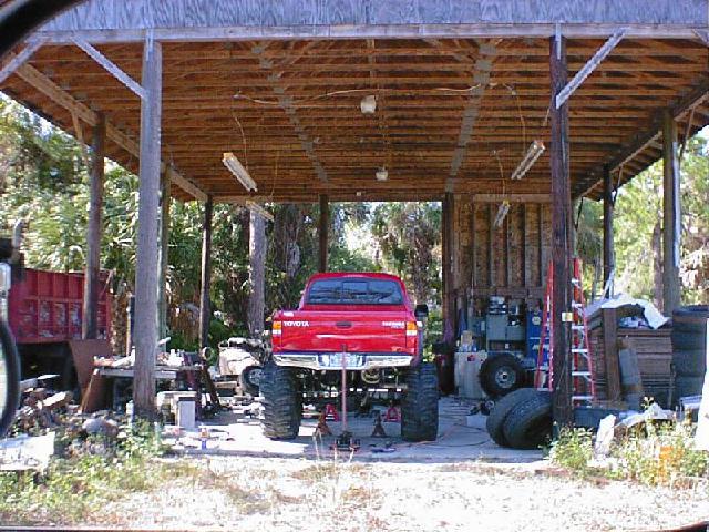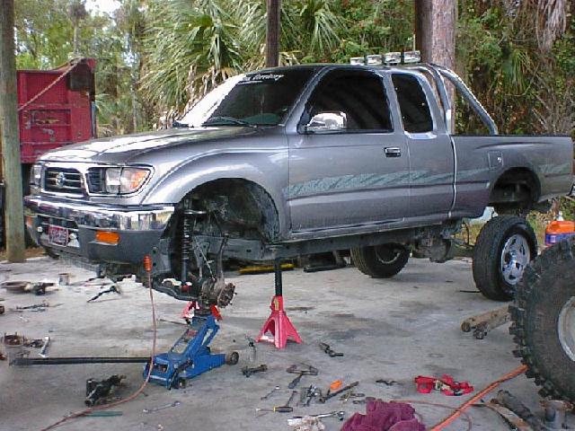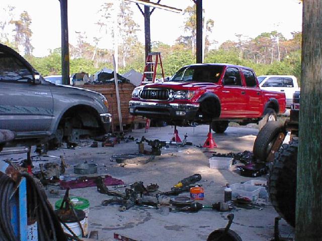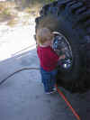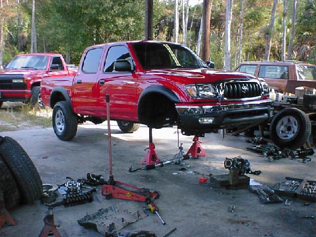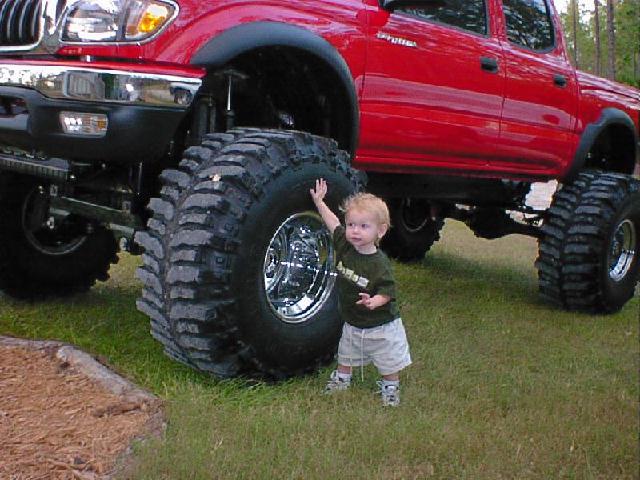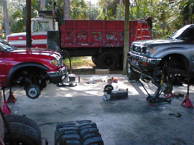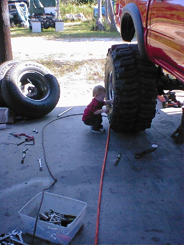 The Build Up Well I had some problems with the way I did mine since I took the lift off another truck that I had. Here are some pics of the process of removing removing the trailmaster lift and bringing a truck with 12" of lift and 40" tires down to a 3" lift and 31" tires. We also put 12" of lift on the new 2001 and of course the 40" tires. One other note, this truck was two days old and had a hundred miles on it before I started tearing it appart. Yes I've been told I need help, and I do agree, I mean it could take a lot to do a front straight axle swap but if I had help it would be esier! Well you can see I had some part time help. If you look close at one of the pics you will see why it took me as long as it did! It was bad enough he was too little to get me the correct tools but he had a real time since he had his eyes closed! LOL Also in the last pics you can see were he's obviously is trying to take all the credit for it! he he